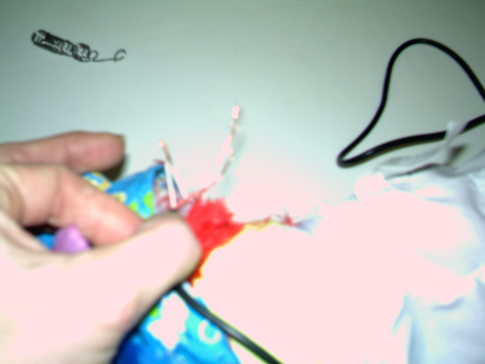 I cut both white wires making sure I didn’t lose the 2 ends that are attached to the motor of the toy.